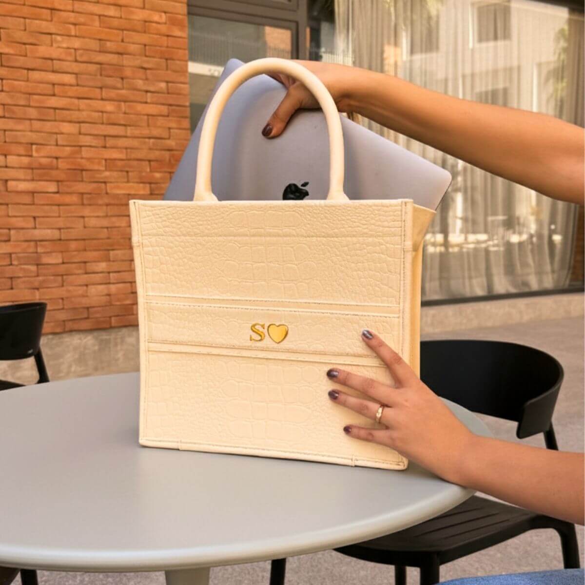 Hazla única con tus iniciales metálicas. Un toque que convierte tu tote en una pieza tan especial como tú.